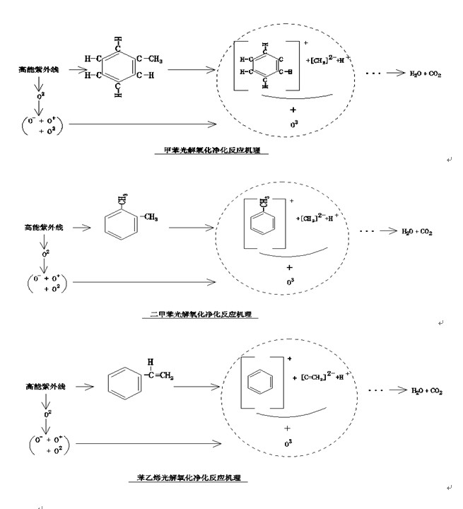 研究表明:活性自由基·OH 的氧化电位(2.8eV)比氧化性很强的臭氧的氧化电位(2.07eV)还高出35%。·OH 自由基与有机物的反应速度高出几个数量级。而且·OH自由基对氧化污染物的反应是无选择性的,可引发链式反应,直接将污染空气中的大部分有害物质氧化为二氧化碳和水或矿物质。其作用机理如下: